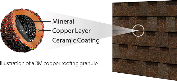 - A minimum 10% blend of evenly distributed 3M Copper Granules among standard colored granules